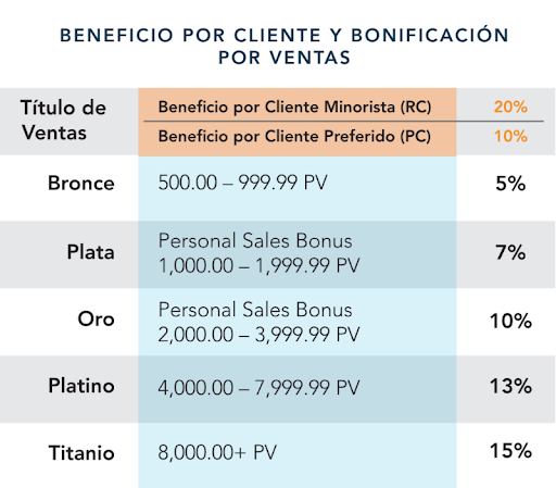 La bonificación de venta es una bonificación adicional que se paga además de su beneficio de cliente. Recibirá este bono una vez que sus compras y las de su Cliente acumulen 800 PV o más en un solo mes. Lo fantástico de esta bonificación es que escala, por lo que cuanto más vendes, mayor es la bonificación, que va desde una bonificación del 5 % al nivel Bronce y una bonificación del 15 % una vez que alcanzas el nivel Titanio.